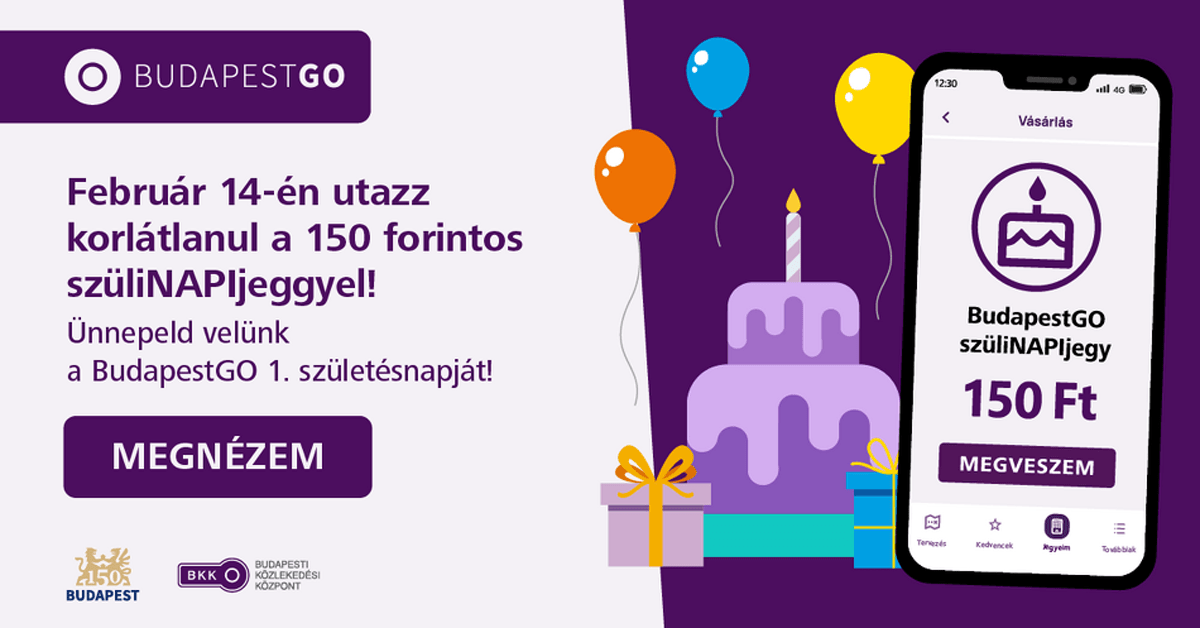 Nem csak az új fejlesztéssel ünnepel a BKK: 2023. február 14-én 150 forintért korlátlan utazásra lesz lehetőség a BudapestGO szüliNAPIjeggyel, amely kitűnő lehetőséget biztosít a közösségi közlekedés és az alkalmazás kipróbálására. Az 150 forintos ár Budapest 150 éves szülinapjára utal – a BKK fontos együttműködő partner a Főváros másfél éven át tartó rendezvénysorozatában.